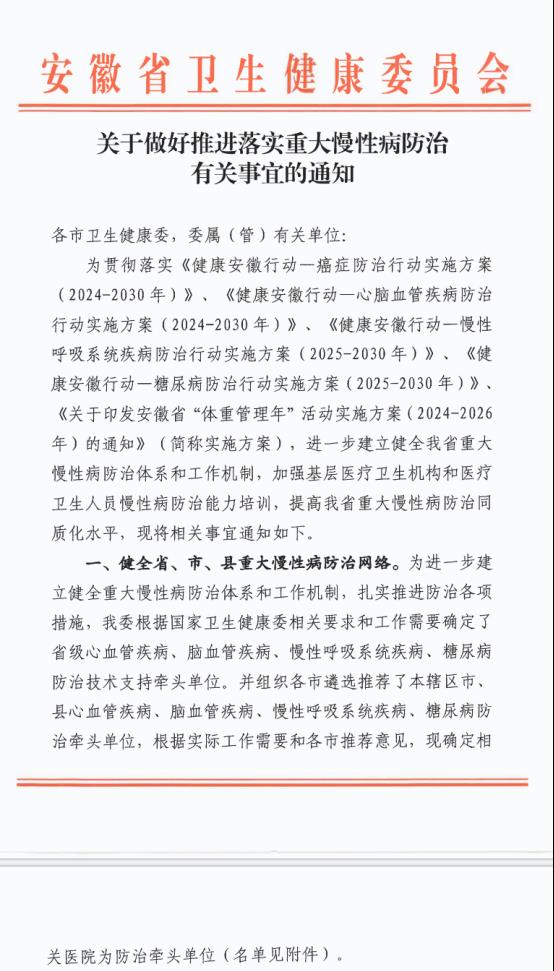 捷报传来,佳绩可期!近日,安徽省卫健委发布《关于做好推进落实重大慢性病防治有关事宜的通知》,我院凭借扎实的医疗技术、完善的防治体系及丰富的重大慢性病防治经验,成功申报成为县级心血管病防治牵头单位、县级脑血管病防治牵头单位、县级糖尿病防治牵头单位,三项殊荣同步落地,彰显了上级部门对我院专科能力与防治水平的高度认可!此次获批,是我院在慢病防治领域深耕多年的重要成果。作为叶集区紧密型医共体唯一牵头单位,我院将主动扛起区域慢病防治重任,牵头搭建区域诊疗协作网络,统筹推进疾病筛查、规范诊疗、康复管理、健康宣教等工作,带动区域内医疗机构协同提升防治能力,为群众提供全周期、一体化的健康保障。未来,我院将以此为契机,持续强化专科能力建设,优化服务流程,创新防治模式,构建优质高效医疗卫生服务体系,守护区域群众心脑血管及代谢性疾病健康,为推进健康区域建设贡献更大力量!